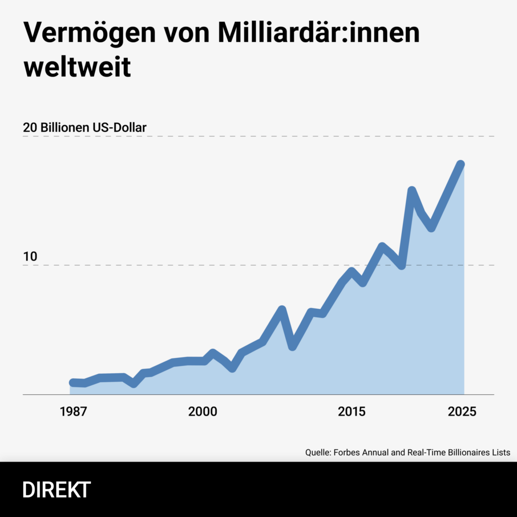Die Zahlen werden jedes Jahr extremer: Seit der Wahl von Donald Trump im November 2024 ist das Vermögen der Milliardär:innen dreimal so schnell gewachsen wie im Durchschnitt der letzten fünf Jahre – gesamthaft auf einen Rekordwert von 18,3 Billionen US-Dollar. Der Anstieg im vergangenen Jahr beträgt 2,5 Billionen US-Dollar – so viel wie die ärmste Hälfte der Weltbevölkerung insgesamt besitzt. Das sind mehr als vier Milliarden Menschen.