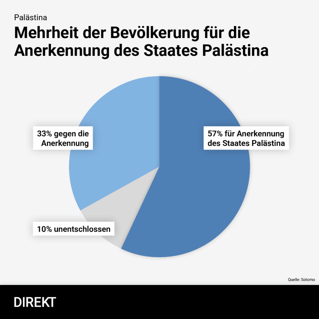 Aussenminister Ignazio Cassis hat sich bisher geweigert, Palästina als Staat anzuerkennen – obschon mittlerweile über 80 Prozent der UNO-Mitgliedstaaten die Anerkennung beschlossen haben. Die ablehnende Haltung des Bundesrats wird von der Schweizer Bevölkerung jedoch nicht geteilt, wie eine repräsentative Umfrage des Forschungsinstituts Sotomo zeigt: 57 Prozent der Befragten unterstützen die Anerkennung des Staats Palästina. Nur ein Drittel ist dagegen und 10 Prozent noch unentschlossen.